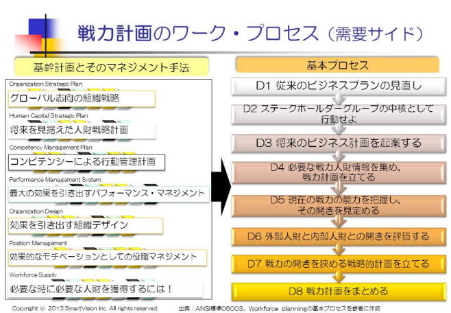 このANSI06003の原案では、戦力計画の概念が公表され、人財の需要(1年以上の戦略的計画を実行するため必要な人財)と供給(現在保有する人財)を明確にします。