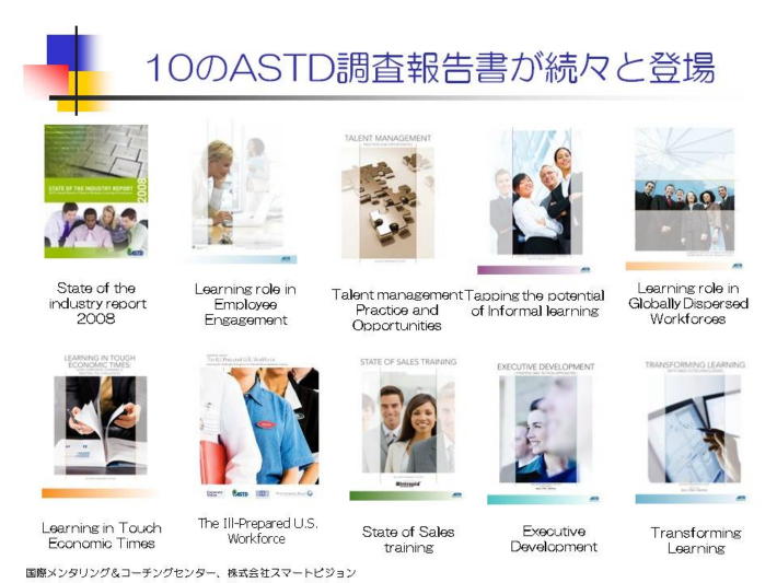 今年は、6月上旬の年次総会前後に、不況時での学習、エンゲージメント、タレント・マネジメント、インフォーマル学習、セールス・トレーニング等々、10以上の調査報告書が発表された。 その概要版は、ホーム・ページで、閲覧出来ます。調査報告の一冊の単価は定価$995となっているものもあるが、年次総会では、5冊まとめて、$200−300程度の特価で販売しているので、これを利用すると良い。この中で、お薦めは、エンゲージメント、タレント・マネジメント、不況時での学習、セールス・トレーニングで、その内容がこの中にも反映されている。 |