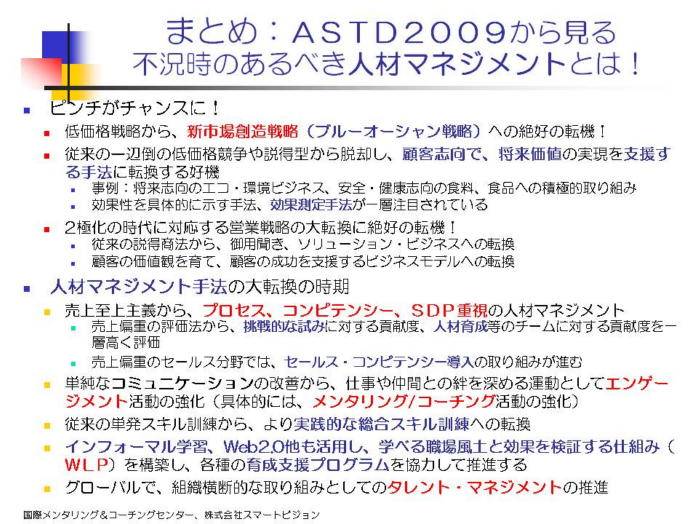 今回のASTD2009年次総会で発表された各種の新しい人材マネジメント手法は、必ずしも、不況対策だけとして、準備されたものではない。しかし、不況時だからこそ注目され、今すぐ行動を起こすことで、大きな抵抗もなく、スムースに導入することが可能になるのである。