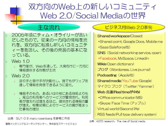 昨年は、インフォーマル・ラーニングと称して、新しい形の学習する職場づくりが、注目を集めましたが、今年は、従来のWeb 2.0から、更に発展したラーニング2.0に進化し、制約が多かったE-ラーニングを更に飛躍させようとの試みでもある。