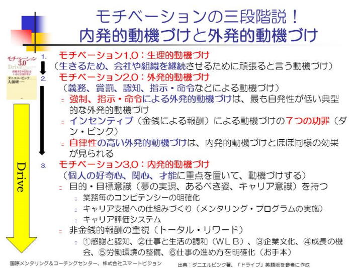 日本では、「ハイコンセプト、新しいことを考え出す人の時代」(三笠書房、大前研一訳)で、おなじみではないですか? この本は、世界20か国語に翻訳された。政治や法学で人々を救えると思って、当初は、法学を勉強したものの、現実の社会では、個人や現場の意識改革が一番必要なのだと気づき、これを実現するため、作家として活躍する決心をした。 2009年発売の「Drive: The Surprising Truth About What MotivatesUs」〈日本では、「モチベーション3.0、持続するやる気をいかに引き出すか!」)では、従来のモチベーションやインセンティブの手法で果たして良かったのかを痛烈に指摘している。これからは、外発的動機づけ(モチベーション2.0)を一層効果の高い内発的動機づけ(モチベーション3.0)に徐々に転換することが必要になる。 具体的には、夢や挑戦を促し、キャリア達成を支援する職場づくりを進めることである。まるで、メンタリングを職場で実践することと同じ世界です。最初から、自らの動機づけが、自分で出来る訳ではないので、必要に応じて、職場でメンタリング・プログラムを実施するなどして、自律人材の育成を組織的に進める必要がある。これが軌道にのれば、モチベーション3.0が、漸く実現出来るようになる。従い、2.0から3.0への転換は、決して、放っておけば、自分で出来るものではない。 |