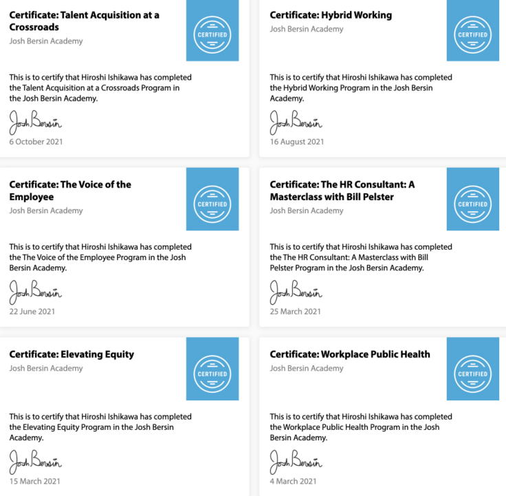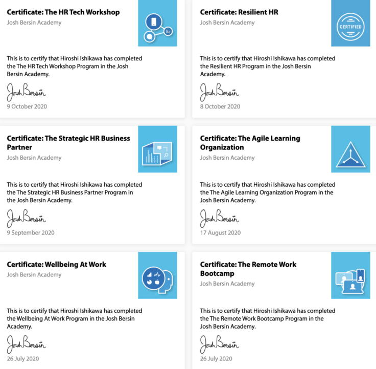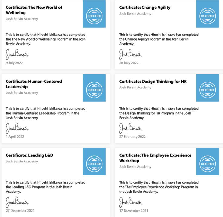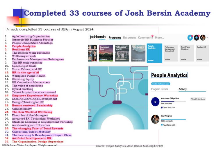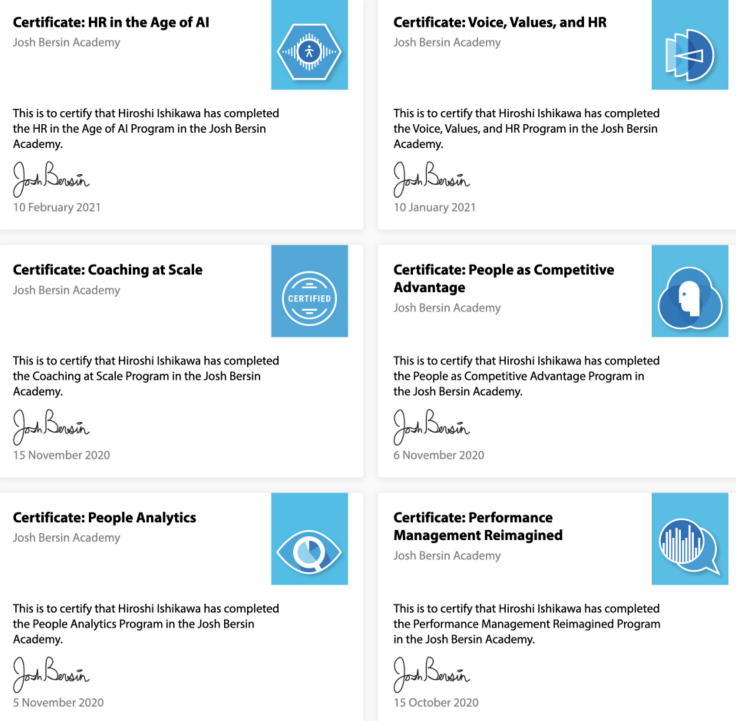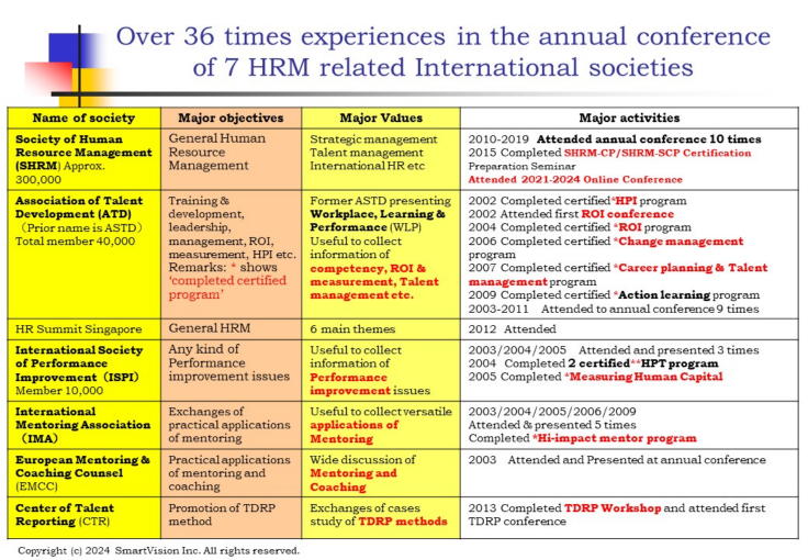 Bachelor degreeof Tokyo Institute of Technology, MBA degree of Keio Business School ■ Job experiences: Worked in Hitachi Ltd, and Sony Corporationover 25 years for Global business management. ■ Major speciality at Human Resource Management (HRM): Mentoring and Coaching,Visualization on Learning process, Measurement of effectiveness, Performance Management, Talent management ■ Activities in HRM related Society: Attended over 36times to the annual conference of ASTD, IMA, ISPI, SHRM, EMCC, HR Summit Singapore, TDRP Conferenceand speaker at IMA, ISPI, EMCC over 9 times. At least 9 certificates holderof ROI, HPI, Talent Management, Organization change,High impact Mentoringand Action learning. Completed33courses of Josh Bersin Academy & Nomadic Academy in 2023. ![]() ![]() ![]() ![]() ![]() ![]() ![]() ![]() ■ Major experiences in Training: Several hundreds times effective trainining of Mentoring and coaching, Performance management, Talent Management and measurement of training for mentor candidates and managers. ■ Books & textbooks: "How to visualize Human Resource development, the key to getting ahead of the competition", Chukei Publication Co. , December 2010, "Mentoring Bible", The International Mentoring & Coaching Center of Japan, February2006、 "Performance coaching", Nippon Jitsugyo Publication, May 2004, "Easy to read, Business Coaching", JMA management center, January 2002 |