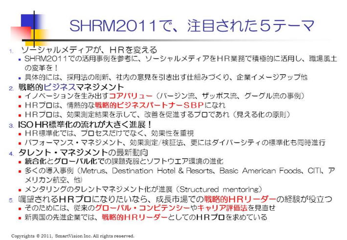 今年のSHRM2011では、昨年同様に下記にあげた5つのテーマが注目を集めた。