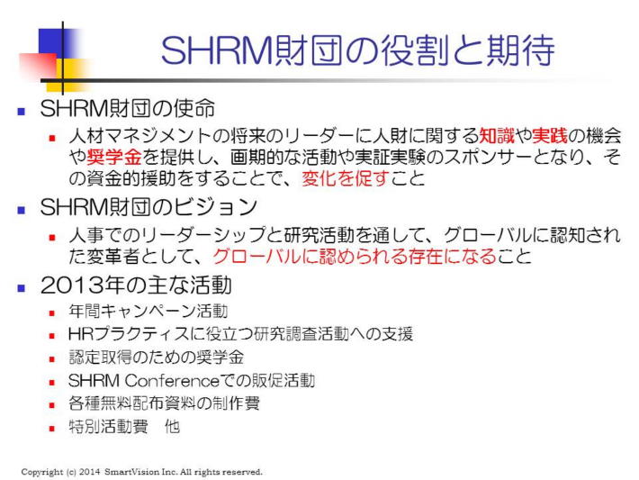 もし、海外のHRプロにも、米国法の知識を要求して、認定者を決めるとすれば、海外HRプロには、至難の認定となる。しかし、その内容をグローバルリーダーに共通して役立つ内容にすれば、海外の学習者の学習意欲も増すことになる。これが先に報告したHRBP(Human ResourceBusiness Professional)や、HRMP(Human Resouce Management Professional)の認定制度である。 今では、海外のHRプロ志願者も活用できる奨学金制度も登場した。 これらの支援活動を実施しているのが、SHRM Foundation(SHRM財団)である。 従来、SHRM財団は、各種の調査活動への支援、HRプロを目指す人への各種の支援活動他を行って来たが、この枠を広げて、HRBPやHRMPを目指す海外のHRプロ志願者にも枠を広げ、$800ドルの奨学金を提供している。SHRM奨学金の詳細は、こちら。 この効果もあり、HRBPやHRMPの選考委員会のメンバーの殆どが、米国以外の国のHRプロがになっている。その中には、ナイジェリア、アルゼンチン、イラン、オーストラリア、ブラジル、アラブ首長国連邦、台湾、フランス、スイス、中国、インドからのHRプロが活躍しているが、日本からは、まだだれも選ばれていない。