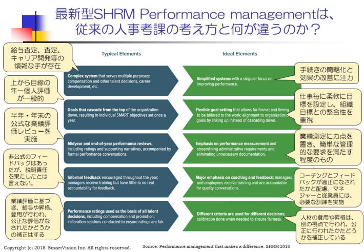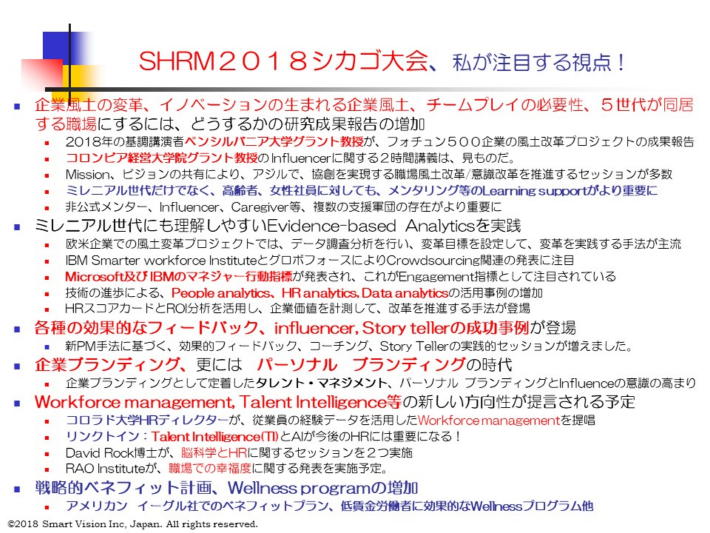 入を決断し、これをビジネスとして推進する方針を打ち出した。SHRM2018コンファレンス では、この関連の導入報告が注目され、これらのセッションは、大ホールで実施しても入りきれ ず、いくつかのサテライトが必要になったほどの盛況を呈した。 また、今年は、基調講演のペンシルバニア大学のグラント教授に他に、コロンビア大学経営 大学院、モチベーションセンター副学長、グラント教授が、如何に効果的に影響をあたえるかの 講演、コロラド大学HRディレクターがWorkforce managementの講演をおこなった。 伝統的な各種のリーダーシップ手法から、関係者にどの様に影響をあたえるのか、やる気にな ってもらうのか、Infulencerとしての存在を目指すセッションが急速に増えてきたと言える。 また、今年は、SHRM発行の資料として、「Performance management that makes a difference :Aneveidence-based approach」が、大量に印刷され、無料配布された。本資 料は、こちらから無料ダウンロード可能だ。 この内容も非常によくできた資料であり、今後のSHRMの基本方針になる、An eveidence- based approachのキーワードが含まれている点に注目したい。 今回のSHRM2018シカゴ大会からも、これからの新しいグローバル人材マネジメントの潮 流を体験する機会はあったが、次回の戦略的人材マネジメント研究会では、「これからの日本 の人材マネジメントは、どうあるべきか!」「私なら、こう変えたい!」を考えてみることに したい。詳細は、こちら。 尚、本研究会では、知識の習得より、みなさんの実務でどう導入すべきかのヒントを得ることを 主な目的としているので、ディスカッションへの積極的参加を期待しています。 |
