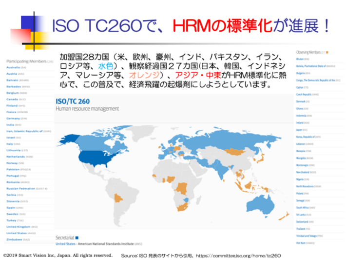 当初は、SHRMが中心になり、Performance managementやCost per hireの標準化を進めたが、当初の委託期間の満了により、2015年に米国国家標準化委員会ANSIにその役割を返還した。 その後は、米国、欧州諸国の他に、オーストラリア、インド、パキスタン、イラン、ロシアが加わり、加盟28カ国の国々により、より広い分野でHRMに関する標準化が進展した。 米国、欧州は、色々な分野で、標準化を進めることで、世界のリーダーシップを握れるとの過去の経験から、標準化には、大変積極的だ。 また、政府の強いリーダーシップにより、人財開発を進める傾向のある国では、ISOによるHRM標準化は、グローバルな考え方を学び、自らの考え方を広める絶好の場として、活用され、国際標準の人財マネジメントの標準的な取り組み方として、政府主導で進め、急速に普及が進んでいる。 一方、日本、韓国、マレーシア、タイ、スイス等の自由主義的な傾向が強い国では、標準化には抵抗感が強いこともあり、慎重論が強く、長年の間、観察経過の状態が続き、この標準化には、正式参加していない。 参加28カ国主導にて、下記に示す、主要13分野でのグローバルHRMの標準化が進められている。 現在は、採用分野での財務指標(メトリックス)や、戦力計画(Workforce planning)の標準化が進み、この指標に基づいたKPIの標準化が終わった。 SHRM2019コンファレンスでは、Result-based KPIs Demonstrating your impactfor Bottom-line results のセッションでは、採用時の基本指標に関して、中東系のコンサルが発表した. 一方、米国系企業で、Metricsの自称老舗コンサル(Competitive Solutions Incs.)が、Metrics that matterのテーマで、より実践的な事例発表を、SHRM2019コンファレンスにて、行っており、これも大変興味深い。この分野でも、熾烈な競合があるのだとの印象をうけた。 また、CSR分野でのISO26000が普及期に入り、その派生モデルである ISO/TR 30406 Sustainable Employability management for organizationや、その報告指針としてのISO30414 Guideline for internal and external humann capitalreporting関連の標準化も、決定し、今後は、こういう報告指針に基づき、CSR報告書が書かれることになる。 ESG投資を引き付けたい企業は、この報告指針に基づき、CSR報告を作成して、発表する必要性が出てくるので、日本の有力企業は、これらの報告手法をマスターして、報告することになる。 今後は、米国、欧州、インド、中東の有力企業は、このような要件を満たすための最低条件として、これらのSDGs関連のISO Guidelineを念頭に、CSR報告書を作成することが求められる。 TC260加盟国では、これらの準備が進んでいるが、日本、韓国のような、未だに、観察経過国では、このような標準化の情報が普及していないことが、HRMの運用面でも不利な状況は、否めない。 今後、数年以内には、現在準備中のテーマ、戦力計画(workforce planning)の本体となるworkforce management、employee engagement、Learning andDevelopment、Diversity and Inclusion等に関しても、そのガイドラインが数年内に整備され、これに基づいた各種の報告書の発行を求められることになる。 これに準拠しないと、優良企業として、SDGsの実践度が評価されないことから、この報告手法に基づいた報告がないと、ESG投資でも不利な状況に追いやられることになろう。 今後は、この基本概念の理解と普及が日本に課せられた大きな課題になる。 |
