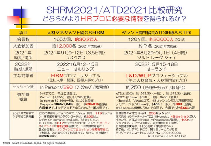 現地参加(In-person)とバーチャル参加を含めて、全体で290セッションになり、11月ごろから、On Demand($239)にて、その殆どのセッションが、1年間、閲覧可能になる。 バーチャル参加でも、119セッションが、閲覧可能で、その多くが、映像つきである。 11月ごろから、オンデマンドにて、そのほとんどが映像つきの閲覧ができるのは、大きな進化である。 いまでは、バーチャル参加が当たり前の時代なので、たとえ、In-personの数が、大きくても、バーチャル閲覧可能でなければ、多くの会員にとって、余り意味がないと言える。 もし、映像付きの閲覧サービスを、何と$239ドルで、一年間提供するならば、これが最大 のメリットになる。 ATDでは、約$600出しても、45セッションだけしかみれないとすれば、価値の低下は、否めない。 また、追加$100だしても、限定の100セッションしか、みれないとすれば、SHRM2021コンファレンスのバーチャル参加よりも、見劣りしており、現地参加しない限り、余り意味がないと言える。現地参加には、ワクチン接種や、旅費と宿泊費が、追加に必要だ。 運悪く、行動制限が適用されると、参加もできなくなるという、最悪の事態になりかねない。 これでは、何のために米国に行ったのかということになろう。 さて、今年のSHRM2021コンファレンスでは、従来の伝統的なテーマの他に、ハイブリット労働、リモート労働が加わり、更には、DEI(Diversity/Equity/Inclusion), IED(Inclusion/Equity/Diversity)というD&Iの進化版も登場した。ADPによる、持続可能なDEIプログラムの発表もあり、多種多彩の内容になっている。 また、離職率の可視化ソフト、マイクロソフトの元幹部の発表、ベネフィット強化による、定着促進対策等々、色々の内容がふくまれている。 詳細は、11月30日のMeetUp(JSHRM月例会)にて、報告させて頂きます。 SHRM2021 コンファレンス報告会の申込は、こちら。 |