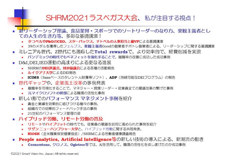 世界最大(現在約30万人)のHRプロのコミュニティー、人材マネジメント協会(SHRM)の2021年度年次総会が、2年ぶりでラスベガスにて開催された。