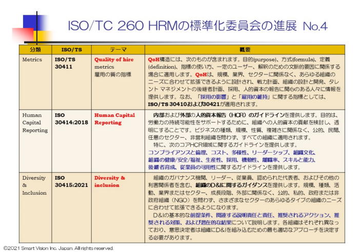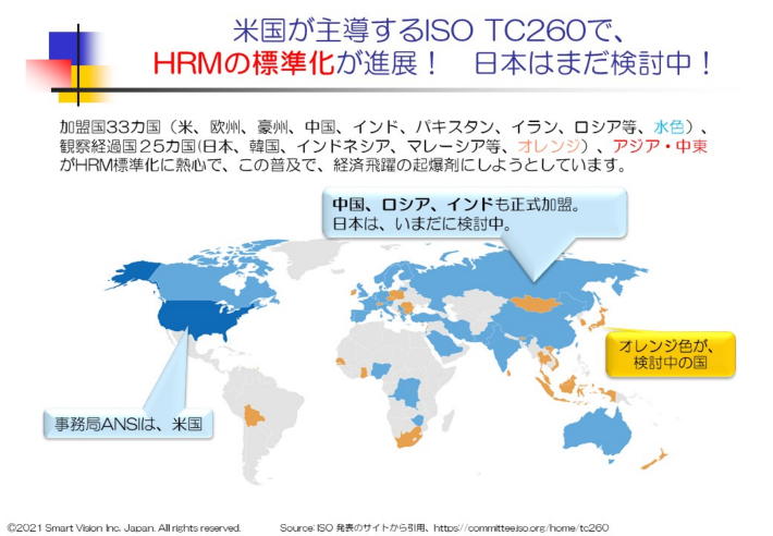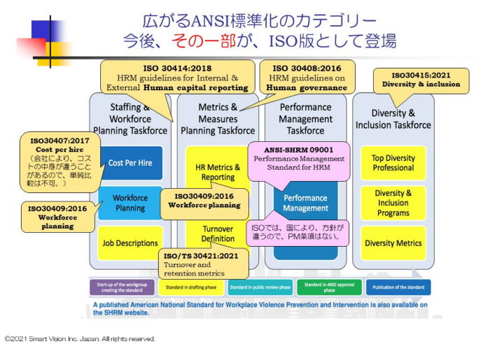 当初は、SHRMが中心になり、Performance managementやCost per hireの標準化を進めたが、当初の委託期間の満了により、2015年に米国国家標準化委員会ANSIにその役割を返還した。 その後は、米国、欧州諸国の他に、オーストラリア、インド、パキスタン、イラン、ロシアが加わり、加盟28カ国の国々により、より広い分野でHRMに関する標準化が進展した。 米国、欧州は、色々な分野で、標準化を進めることで、世界のリーダーシップを握れるとの過去の経験から、標準化には、大変積極的だが、近年では、中国、ロシア、インド、サウジも正式参加し、アジアで参加してないのは、日本、モンゴル、韓国、タイ、ベトナム、インドネシア等で、出遅れ感が、濃厚だ。 また、政府の強いリーダーシップにより、人財開発を進める傾向のある国では、ISOによるHRM標準化は、グローバルな考え方を学び、自らの考え方を広める絶好の場として、活用され、国際標準の人財マネジメントの標準的な取り組み方として、政府主導で進め、急速に普及が進んでいる。中国は、すでに貿易協定でのTPPにも、参加表明しており、国際的な標準化には、大変積極的になっており、日本も、もたもたしていると、完全に追い越されてしまうことでなろう。 すでに、CSR分野でのISO26000も普及期に入り、その派生モデルである ISO/TR 30406 Sustainable Employability management for organizationや、その報告指針としてのISO30414 Guideline for internal and external humann capitalreporting関連の標準化も、決定し、今後は、こういう報告指針に基づき、CSR報告書が、必須になることになろう。 ESG投資を引き付けたい企業は、この報告指針に基づき、CSR報告を作成して、発表する必要性が出てくるので、日本の有力企業は、これらの報告手法をマスターして、報告することが必須になる。 今後、数年以内には、現在準備中のテーマ、戦力計画(workforce planning)の本体となるworkforce management、employee engagement、Learning andDevelopment、Diversity and Inclusion等に関しても、そのガイドラインが数年内に整備され、これに基づいた各種の報告書の発行を求められることになる。 これに準拠しないと、優良企業として、SDGsの実践度が評価されないことから、この報告手法に基づいた報告がないと、ESG投資でも不利な状況に追いやられることになろう。 今後は、この基本概念の理解と普及が日本に課せられた大きな課題になる。 |