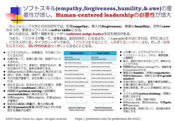 米国の失業率は50年ぶりの低水準にありながら、退職は20年ぶりの高水準にあり、経済はさらに多くの雇用を増やし続けている。 それだけ、「優秀人財にとって、企業における従来型の人材マネジメントでは、満足できない厳しい状況にある」といえる。 世界最大のHRプロのコミュニティーである人材マネジメント協会(SHRM)(会員31.6万人)が主催する人材マネジメントの最大の祭典SHRM2022コンファレンスには、オンラインを含む過去最大の35,000名が終結した。 その中で、一番注目を集めたのが、Human-centered Leadership/managementだ。
