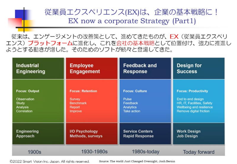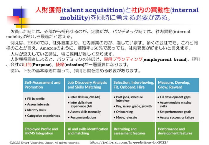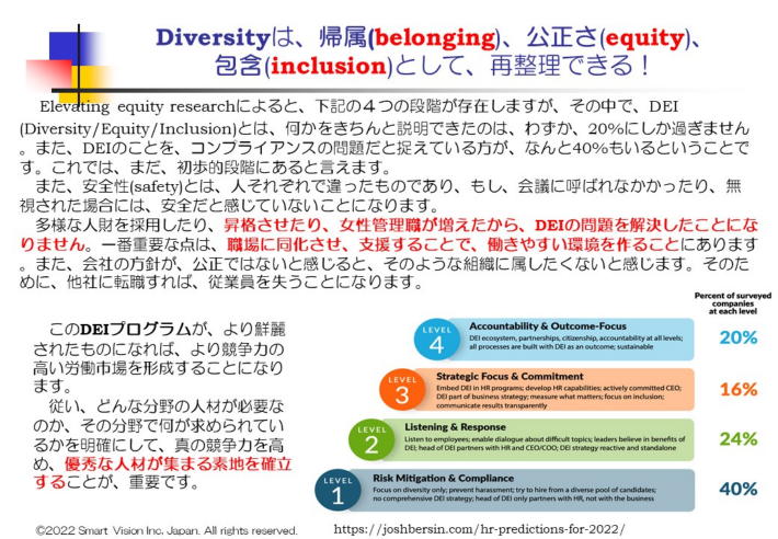 この流れは、最近始まったものではないが、使えるソフトやAIをはじめとした多くの技術が、急速に充実したこともあり、多くのHRプロが、これらのソフトを積極的に活用する時代が、ようやく到来したと言えよう。 また、欧米企業でも、単純に優秀人財を獲得する努力するだけでなく、社内での異動の可能性をしめし、希望により、色々なキャリアを積むことができる点を魅力として、アピールする重要性がましている。 雇用ブランディング(employment branding)を高めておかないと、優秀な人材が集まらないという時代になったともいえます。 更には、従来は、エンゲージメントの改善として取り組んできものを、EXplatformとして、格上げし、より魅力的な内容にUpgradeする動きが進んでいます。 他社のEXplatformの方が、魅力的だと思われるようになると、優秀人財の異動が現実化する動きが進みかねないからだ。 また、今年のSHRMコンファレンスの特徴は、色々な形のDEI/IEDの活動が活発になった点である。SHRM内に、DEI/IEDの別の協議会が存在したりして、互い切磋琢磨しているは、大変興味ある情況である。 このほかに、Remote勤務に伴うWorkplace strategy, Wellbein strategy, Healthyorganization. 新種のLeadershipの登場、給与に関しても、変動型の給与体系、イノベーションが起きる職場に転身するには、等々、色々な発表がなされている。 次回の7月27日のSHRMコンピテンシー研究会では、技術関連の新コンピテンシーを含めて紹介する予定です。 8月31日(水)には、総集編として、報告させて頂きますので、ぜひ参加ください。 申込は、こちらに |