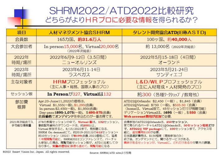 現地参加(In-person)とバーチャル参加を含めて、全体で327セッションになり、9月ごろから、On Demand($199)にて、その多くのセッションが、1年間、閲覧可能になる。 バーチャル参加でも、132セッションが、閲覧可能で、その多くが、映像つきだ。 9月ごろから、オンデマンドで、そのほとんどが映像つきのセッションが閲覧ができるのは、大きな進化である。 いまでは、バーチャル参加が当たり前の時代なので、たとえ、In-personの数が、大きくても、バーチャル閲覧可能でなければ、多くの会員にとって、余り意味がないと言える。 ATDでは、たとえ、現地参加しても、250セッションしかなく、バーチャル参加では、通常料金では、45セッションしか見れず、更に100セッションみるには、追加$100が必要になり、Web accountまで、要求される状態だ。これでは、総合的な価値の低下は、否めない。 これでは、SHRM2022コンファレンスのバーチャル参加よりも、明らかに見劣りしており、高い費用をだして、現地参加しない限り、参加する意味が余りないと言える。当然のことながら、現地参加には、ワクチン接種や、旅費と宿泊費が、追加に必要になる。 SHRM2022コンファレンスでは、従来の伝統的なテーマの他に、ハイブリット労働、リモート労働が加わり、更には、DEI(Diversity/Equity/Inclusion), IED(Inclusion/Equity/Diversity)というD&Iの進化版も登場した。Human-centered Leadership/Managementが注目を集めており、Mental Health Careをテーマに、地域社会に貢献したHumanaのCEO/CAO、マスコミ界からは、Huffington Postの創業者Arianna Huffinton、更には、第43代大統領のGeorge Bushが登場する。Diversity&Inclusion専門家が、MCを務める等、多様性に富んだ内容になっている。 詳細は、8月31日の戦略的人材マネジメント研究会にて、報告させて頂きます。 SHRM2022 コンファレンス報告会の申込は、こちら。 |