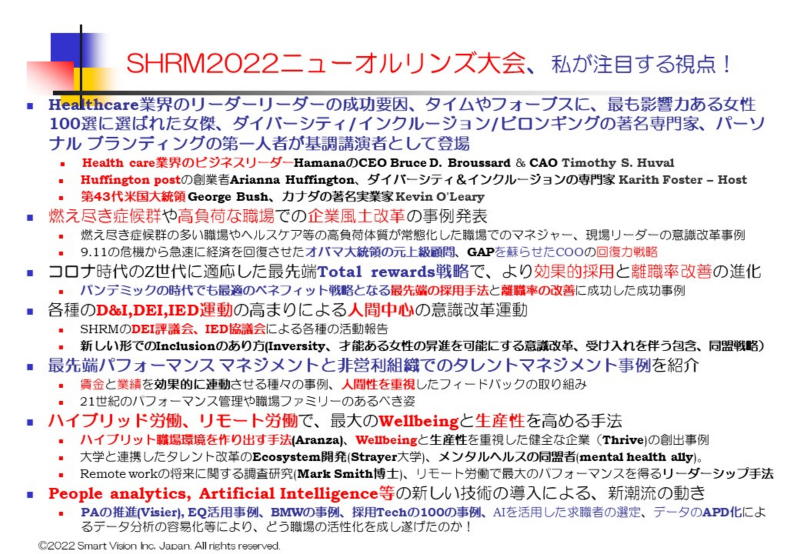 世界最大(現在約31.6万人)のHRプロのコミュニティー、人材マネジメント協会(SHRM)の2022年度年次総会が、ニューオルリンズにて開催された。