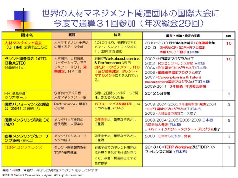 人材育成・人材開発のプロフェッショナルのための7つの国際大会で、過去31回参加し、通算9回、英語で成果発表、世界の著名な国際団体の9つの認定プログラムを修了し、その成功事例を世界に発信し、共感出来る人を世界に求め、世界をリードしています。具体的には、国際的人材開発団体である全米人材開発協会ASTD(通算7回)、米国の国際メンタリング学会IMA(通算5回)、国際パフォーマンス改善協会ISPI(通算3回)、欧州メンタリング&コーチング協議会EMCC(1回)に参加し、また通算9回の成果発表。欧米での人材育成、人材開発の状況、日本の現状との違い、問題点を把握し、安心してご利用いただける確実な内容になっております。アジアで一番実績のある「人材育成・人材開発、及びメンタリングの達人」として、知られています。 |