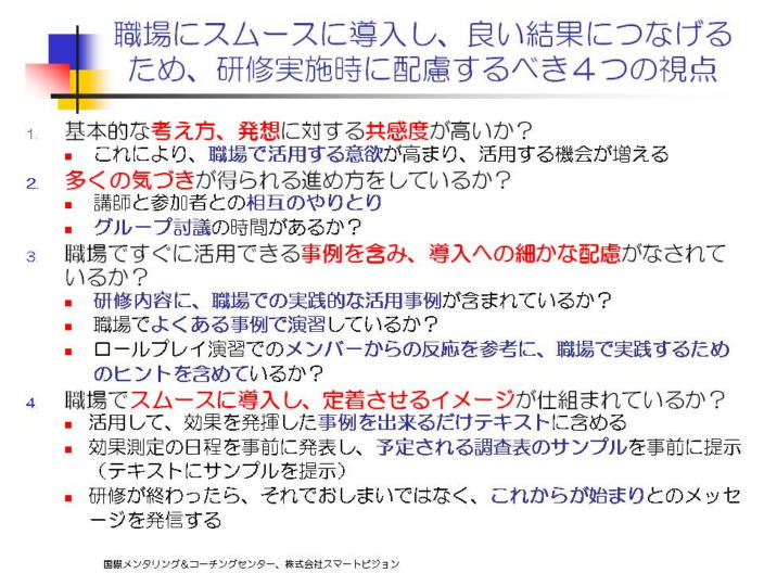 最初の研修後、顧客とのやり取りを通して、コーチングを実務で試した結果の成功体験、失敗体験をもとに、その改善点を振り返りながら、コーチング・スキルの定着化と更なる改善を目指します。 各種のフォローアップ研修もありますので、詳細に関しては問い合わせください。 |