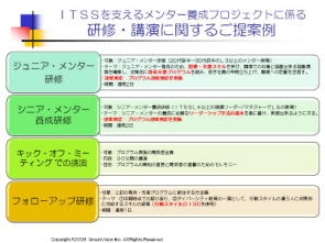 当センターの実施する研修では、効果ありそうだ、職場で是非使ってみたいと思わせる内容がふんだんに含まれており、職場に復帰後、実際に活用したのか、その結果、効果があったのかをアンケートで追跡調査するお手伝いをしております。このような支援することで、職場でキチンと導入されたかを把握し、改善することが出来るようになります。 4−3 目標達成型、ソリューション志向の仮説検証型のプロジェクト支援サービス事例 研修前の打ち合わせをキチンと行うことで、課題を明確にし、そのために必要な前提条件を整えながら、準備を進めるプロジェクト支援を総合的に計画、実施します。6つの事例を参考までにご覧ください。これらのプロジェクト事例は、研修のしっぱなし、担当に全てまかせっきりではなく、チームでフィードバックし、改善する仕組みを如何にしてつくるのかの、具体策のもとに計画的に実施しており、確実な結果に結びつけることが可能になります。