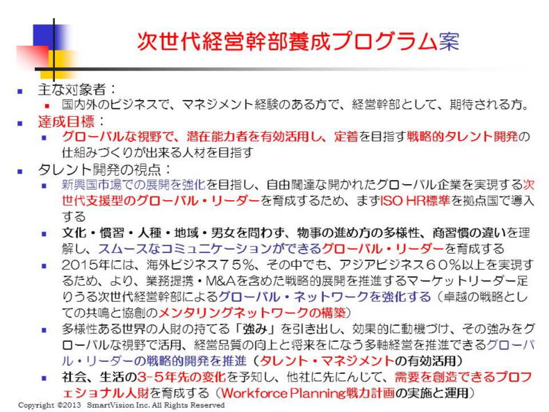 | 次世代経営幹部には、会社の目指す基本方針(例えば、グローバルビジネスの拡大、新規ビジネスの立ち上げ等々)に沿った具体的計画の中から、6ヶ月プログラムの目標を選びます。 この実現のために、核となるラインマネジャー、将来有望なタレント人財の中から、協力的な人財を抜擢して、チームを構成し、3−5年の戦略的計画を立案します。 この実行に必要なタレント人財をどう育てるかが、「統一テーマ」になります。 この実践には、当然のことながら、職場でのラインマネジャーの意識改革、メンターの育成、キャリアプランの提示、効果的なモチベーション、評価システム、コンピテンシー項目が含まれます。 パフォーマンス・マネジメント、タレント・マネジメント等の既存のインフラをどう活用して、実現するのかが、主なテーマになります。 最大のテーマは、組織の目標を可能にする「タレント開発の進め方と実践事例」になります。 この中には、当然のことながら、将来を見据えた「戦力計画」と、現在の人財とのギャップをどう狭めるのかの改善計画を提示することも含まれます。 これらの戦力計画を、「スムースに実践できる人財」こそが、次世代の経営幹部に相応しいと考えるからでもあります。 |