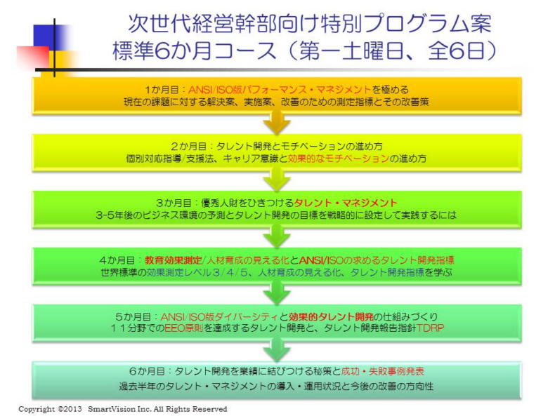 | 一例として、6ヶ月プランを下図に示しましたが、グローバル展開する場合には、ANSI/ISO HR標準化の最新動向等の世界の最新の人財マネジメントの動向を念頭に、これにどう対処すべきかを検討する必要があります。 そのために必要な基礎知識と参考事例を、研修内に提示しますので、これを参考に、各自の目標達成への基本プランを立て、実行部隊となるラインマネジャーと実行チームを編成し、6ヶ月間この教育プログラムを実践し、チーム内での相互の効果測定をして、改善案を引き出します。 尚、11分野での雇用機会均等原則EEOとダイバーシティに関しては、こちらをご覧ください。 下記には、6ヶ月コース案の一部を参考までに、掲載しました。 具体的プランに関して、色々の事例がありますので、無料見積もり相談にて、問い合わせください。 |