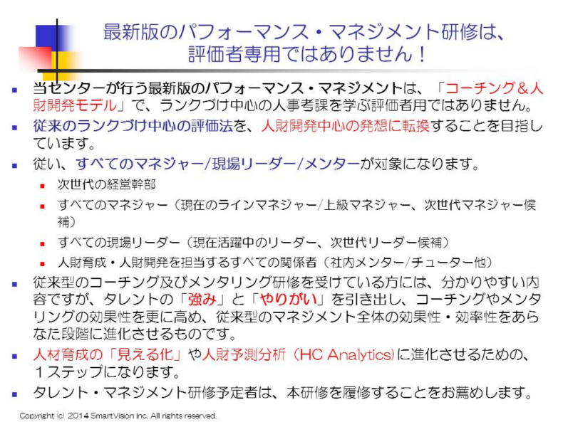 | 最新版パフォーマンス・マネジメント研修は、評価者研修ではありません! |