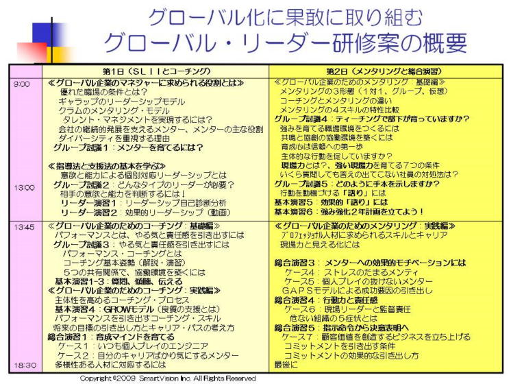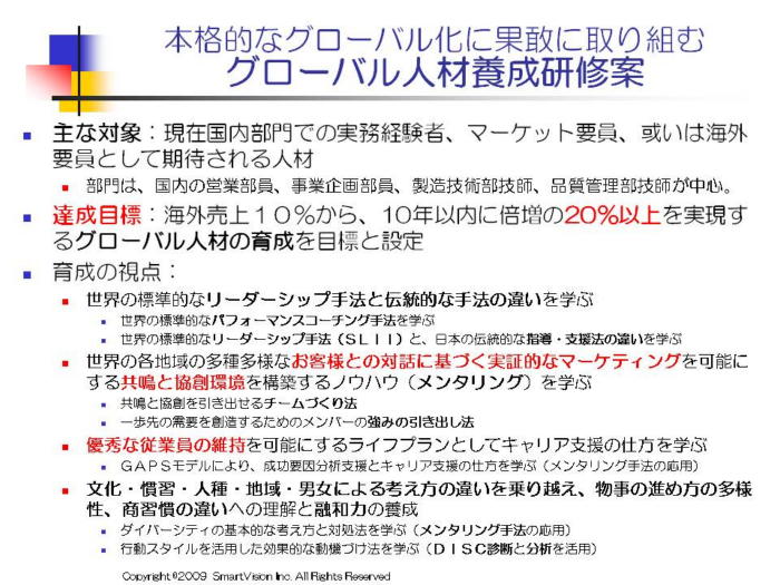 今後、国際ビジネス比率を、例えば、現在10%程度から、20%以上に引き上げる事を目 標に、グロバール人材を育成します。グローバル人材の養成は、世界の標準的なリーダーシップ法をまず学ぶことから始めたいと考えます。試しに、若手社員の育成及び一般社員に対しても、新規プロジェクトの立ち上げを通して、具体的な育成支援プログラムのスムースな導入手法、職場での定着法を学びます。この中で、育成することの素晴らしさ、やりがいと学んで頂ければと考えております。その中で、どんな特徴を生かしていくべきなのか? また、フォローアップ研修では、ダイバーシティ(多様性)の対応をテーマに、すでに学んだ育成支援プログラムを活用して、応用事例を増やします。 |