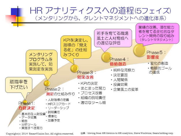 その中の「Moving fromHR MetricstoHR Analytics」で提唱されているHR アナリティクスの5フェーズを紹介しましょう。 この事例でもわかる通り、HR アナリティクス では、既存の勤務データを引き出してくると言う発想ではなく、戦略的な目標を設定することから、始まります。これが、方針決定です。 例えば、離職率が高いので、これをどの程度まで、改善するかの方針を立てます。これがフェーズ1の段階です。 そこで、離職した理由を深堀して、調査します。特に注目すべき部署、その背景に注目します。 例えば、「同じ職場の人が忙しく面倒見てられない」のであれば、職場で後輩を育てる職場風土がどれだけ会社全体に根ざしているのかを把握するための調査を行います。 例えば、「メンターを決めて、メンタリング・プログラムを開始する」と言う方策を決め、実行に移します。ここまでが、フェーズ2です。 このメンタリング・プログラムの実施後、どのような効果があったか、どのようなKPIを見える化するかを決め、改善効果を把握し、更なる改善を促します。ここがフェーズ3と言えます。 更に、この風土を職場に定着させるには、どうしたらよいのか、会社全体に広げるには、どうしたら良いのかを考え、会社全体の協力を促します。この時点で、一定の効果があった事例を示せないと、他の職場やトップからの理解も得られないということになります。これがフェーズ4の時期になります。 ここで頓挫すれば、業績への影響を見ることなく、もとの状態に戻ってしまうこともあります。