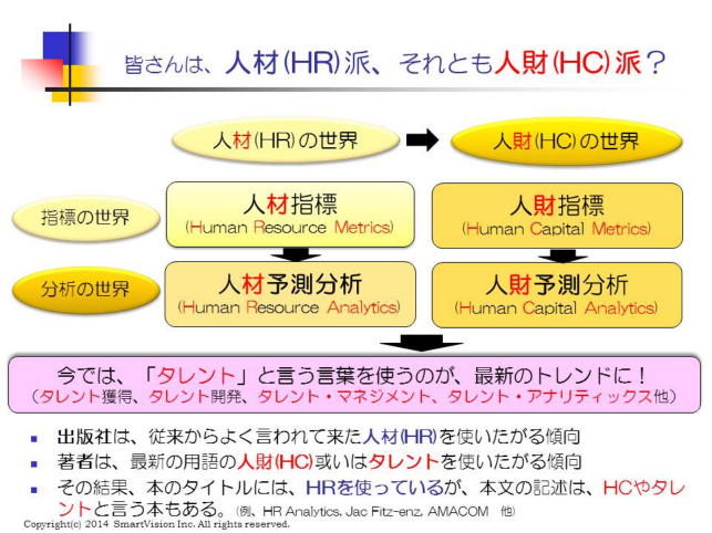 タレント獲得(Talent Aquisition)は、外部からの採用だけでなく、「社内から潜在能力がある人財」を、獲得することを含みますので、この言葉を使うケースが増えています。タレント開発(Talent Development)は、現在の職場では活かされてない潜在能力を探し出し、それを活かせる職場環境を探しだすことであり、必ずしも現在の職場がやるべき仕事だとも決めつけられません。 更には、最近、聞く機会が増えているタレント分析(Talent Analytics)は、まだ使われてない潜在能力を持った人財から、その能力を活かせる職場の創造、新規の挑戦を支援する態勢づくりのために行っており、HRプロ(戦略的ビジネス・パートナーSBPを目指す人財マネジメントのプロ)の存在が、重要になります。 このタレント分析を支援するための基礎データの入手/分析のために、人材・人財予測分析(HR アナリティクス)が注目されています。 欧米諸国では、タレント分析用に見える化情報サービスを行うベンダーも、いくつかあります。 |