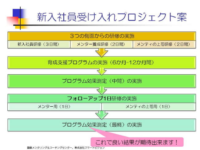 新入社員用の育成支援プログラム終了後に効果測定を実施すると、ほとんどのケースで、約90%以上のメンティは、このプログラムを好意的にとらえており、社会問題にもなっている3年以内に離職率30%以上と言う状況も改善に向かいます。 基礎教育の分しか予算がないので、メンター教育までは、難しいと考える傾向が一部にありますが、、メンター教育は、新入社員だけではなく、将来色々なプロジェクトのスムースな立ち上げにも活用できることや、若手メンターの育成により、先輩と後輩のチームワークや協働環境が改善されるなどの副次的な効用も多く、一度メンターが育てば、新人の育成以外でも、同じ育成スキルが使える様になります。育成意欲の高い職場では、職場の活性化につながり、業績も改善した事例が多々あります。 |