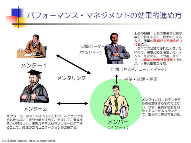 くれぐれも、「おれは自分で勉強して、頑張ったものだ」と言って、まだ慣れないメンバーを放任すると、最終的に期待外れになることが多く、本人の努力不足もさることながら、その多くの責任は、放り出した上長の責任になります。 若手人財の活性化もかねて、やる気のある若手メンターを抜擢して、やる気にしたり、メンバー(メンティ)、メンターへの適切なフィードバックやモチベーションが有効になります。これらの人材育成でのパフォーマンス・マネジメントが、上長及びメンターの今後の大きな課題となります。 これら全体のパフォーマンスをどれだけ改善できるかが、パフォーマンス・マネジメントの神髄なのです。 よくある誤解に、「パフォーマンス・マネジメントは、評価者用なので、自分には関係ないと考える方が結構多い」ですが、決して、評価者用に行われているものではなく、マネジャー/現場リーダー/スーパーバイザー/メンターにとっても、大変重要なベースとなるマネジメント手法と認められており、ANSI/ISO HR標準として、パフォーマンス・マネジメント条項にとりいれられました。 「新版のパフォーマンス・マネジメントを自然に実践できる人財こそが、次世代のマネジャー/リーダー」と思われる様になりました。 詳細は、こちらをご覧下さい。 当センターが主催するワークショップ、企業向け研修では、これらの概念を理解した上で、実践的な学びを沢山得ることができます。 |