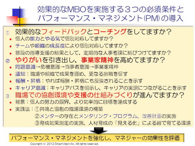 従来の目標による管理(MBO)では、目標を設定したら、「担当者の能力ややる気とは関係なく、頑張ってやれば良いもの」と思いこみ、何かわからないことがあったら、質問してもらって、それだけ対応すれば、十分と考える傾向がありました。これは、確かに仕事なれた人には良くても、まだ慣れない未経験なメンバーや、全くの未体験ゾーンの仕事をする場合には、チームとして支えていく仕組みづくりが必要になり、これを実行することで、育成効果は飛躍的に高まります。これが、十分になされないと、無駄が多く発生したり、やってみたけど、うまくいかないケースが多発するのです。 パフォーマンス・マネジメントの視点から、下記の3点に配慮する必要があります。 |