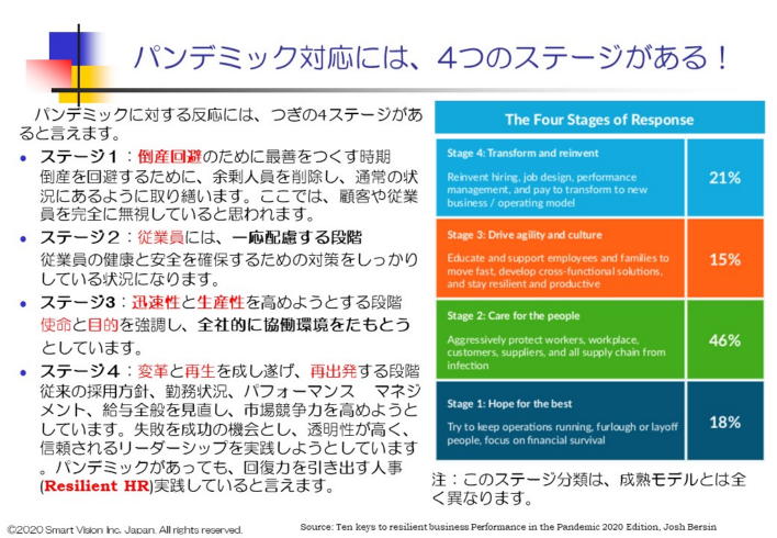 確かに、信頼(trust)、同情(empathy)に焦点を絞り、多様性(Diversity),、給与の平等感(pay equity)、会社への一体感(Inclusion)、しあわせ感(Wellbeing)を感じる職場体験(work experience)の機会を増やし、人中心の戦略(people centric business strategy)を強調する傾向が増しました。 しかし、このレベルでは、パンデミック対応の4段階の中の、第2段階から、第3段階の初期的状況にあると言えます。これでは、まだ、レジリエントHRが達成できたとは言えません。 本来のレジリエントHRは、ステージ4以上の段階に到達する必要があります。 今回の調査結果では、このステージにあるのは、全体の21%に過ぎません。 皆さんの会社では、どのステージにありますか? |