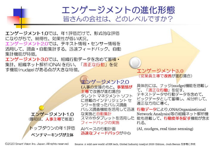1940-80年代では、監督やマネジメント支援の傾向が、強かったものが、2000年代になると、各事業部に対するビジネス支援の傾向が強まり、ビジネスへの貢献度を問われる時代になりました。HRプロは、戦略的ビジネスパートナー(SBP)としての活動が求められるようになり、潜在能力者の強みに力を入れて、支援すべきであり、会社の宝として、タレント・プールすることが、求められるようになったのです。 この時期に急速に普及したのが、戦力計画の重要性や、それを実践するタレント・マネジメントの動きです。この導入により、エンゲージメントも2.0に突入することになります。 2010-2020年代になると、最新版パフォーマンス マネジメントも普及し、グーグルでのPeople analyticsが起爆剤となり、行動データをデータ解析する組織ネットワーク解析(ONA)等を導入するHRテックの普及が進みました。これを導入して、行動データに基き、適切な対策をとっている企業では、エンゲージメント3.0になったと言われます。 ![]() |
