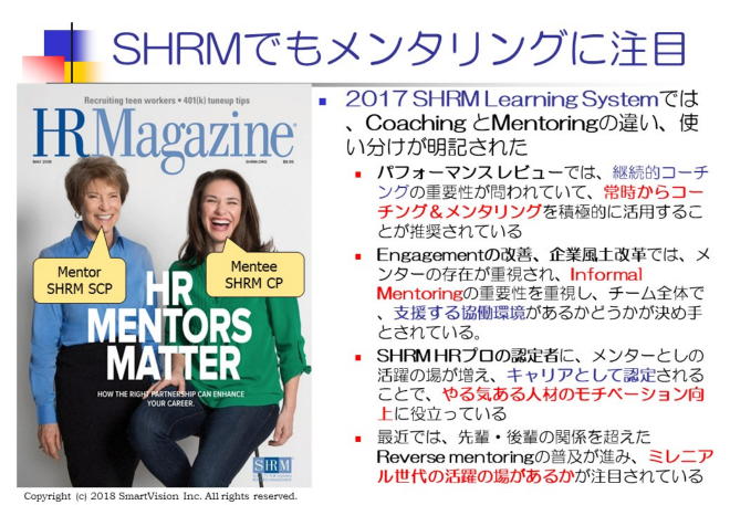 ンターになり、SHRM CPをメンティとして、メンタリングをおこなったり、HR Professionalが、各事業事業部のマネジャーや現場リーダーをメンティとして、キャリア メ ンタリングを推進する事例も紹介されています。 また、SHRM SCP/CP 認定者には、会社全体のキャリア メンターとして、活躍が期待さ れているとのメッセージを送っています。 |