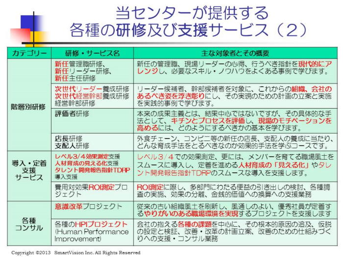 (6) 各種マネジャー、リーダー研修用のケース・スタディの自主制作と蓄積 (7)幅広いパートナーとの連携の実績