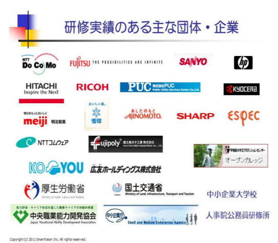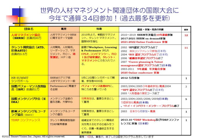 人材育成・人材開発のプロフェッショナルのための7つの国際大会に、通算32回参加し、計9回英語で成果発表、11つの認定プログラムを修了。アジアで一番発表実績のある「人材育成・人材開発、及びメンタリングの達人」として、知られています。全米人材開発協会ASTD(通算10回)及び 国際メンタリング学会(通算5回)、人材マネジメント協会SHRM(通算4回)、国際パフォーマンス改善協会ISPI(通算3回)、欧州メンタリング&コーチング協議会EMCC(1回)等に参加し、日本での導入事例を国際メンタリング学会IMA(通算5回)、国際パフォーマンス改善協会ISPI(通算3回)、成果発表を行った実績があります。欧米での人材育成、人材開発の状況をキチンと把握して、世界の最先端の人材開発の潮流をキチンと把握し、企業研修・ワークショップ・研究会等、日本の同志への情報提供を積極的に行っており、グローバル企業を目指す企業に最適な研修内容になります。