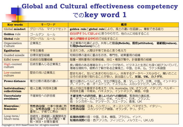 しかし、海外といっても、欧米諸国、ラテン系、アジア系、イスラム系等では、全く違います。 同じアジア系でも、韓国、台湾、中国でも異なります。 一体、どんな点が違うのでしょうか? 彼らにどう対抗すべきなのでしょうか? 今回のコンピテンシーで使われるキーワードは、なんと3ページになります。 最初の1ページを下記に掲示しましたので、ごらんください。 それだけ、知って置くべき点が多いということです。