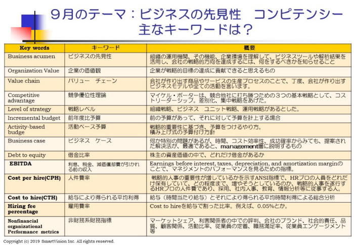 ◆開催日:9月開催:2019/09/18(水) 19:00-21:30 ◆テーマ:グローバル人材マネジメントのグローバル標準になった、 9月テーマ:ビジネス先見性を伸ばすコンピテンシー 今月のテーマは、Business Acumen competency、つまり「現在の問題を把握して、早めに対策する
