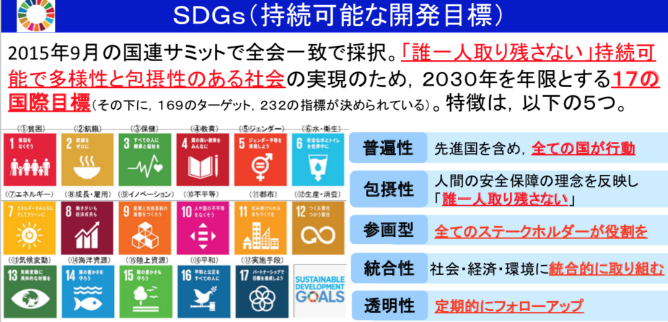 日本の外務省の説明によると、持続可能な開発目標(SDGs)とは,2001年に策定されたミレニアム開発目標(MDGs)の後継として,2015年9月の国連サミットで採択された「持続可能な開発のための2030アジェンダ」にて記載された2016年から2030年までの国際目標である。 |