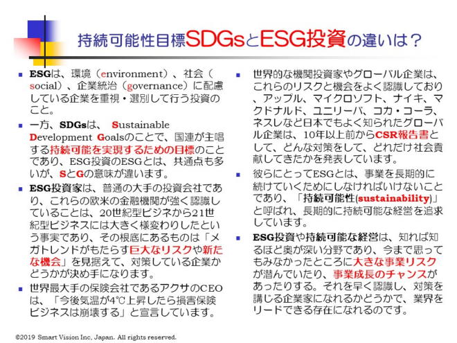 ESGとは、E(環境)、S(社会)、G(ガバナンス)に配慮している企業を重視・選別して行う投資であり、国際連合が2006年、投資家がとるべき行動として責任投資原則(PRI:Principles for Responsible Investment)を打ち出したことから、ESGの観点から投資するよう提唱したため、欧米の機関投資家を中心に企業の投資価値を測る新しい評価項目として関心を集めるようになったものである。 従来の投資が売上高や利益など過去の実績を表す財務指標を重視したのに対し、ESG投資は環境、社会、企業統治を重視することが結局は企業の持続的成長や中長期的収益につながり、慈善事業などの社会貢献と経済的利益の両方をねらう「インパクト投資」といった側面もある。 欧米先進企業や一部の日本の大手グローバル企業も、CSR報告書を出すことで、これらの投資を得て、その中で、持続可能性を追求する企業としての企業ブランドを高めたこともあり、これからの事業成長の機会を得られる企業として認知されるようになった。 |