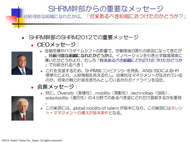 当時の連邦政府は、何が最大の原因だったのか、大型リストラを事前に防ぎ、持続可能な組織を目指にはどうすべきなのか、人材マネジメント関連の最大のネットワーク組織の人材マネジメント協会SHRMに報告する様に命じた。 その中で、確かに、革新的な商品が出てくることが必要ではありますが、それ以前に重要な点は、優秀な人材にも魅力を感じる職場環境を整備すると同時に、将来必要な戦力を特定し、戦略的に配置、育てる戦略的施策としての戦力計画を進めることが最大の課題だと考えた。 今後の経営者の評価は、好きなことを自由にやらせて、革新的な商品を送り出したかより、むしろ「将来あるべき姿に、どれだけ近づけたか」どうかで判断すべきものだ。 これを支援するため、SHRMが中心となり、HRプロフェッショナルを育てるプロジェクトを開始することを宣言し、色々と不満の多かった従来のパフォーマンス マネジメントの仕組みを見直し、Workforce planning(戦力計画)等の標準化の旗振りをすると発表した。 この計画に基づき、知識ベースに偏りがちであった、従来のHRプロ認定を、SHRM自らが推進することにし、SHRMコンピテンシーを発表した。 このSHRMコンピテンシーをベースにした SHRM HRプロ認定を2015年から開始したことで、当センターでも、2015年12月から、JSHRM 自主運営研究会として、SHRMコンピテンシー研究会を立ち上げた。 |