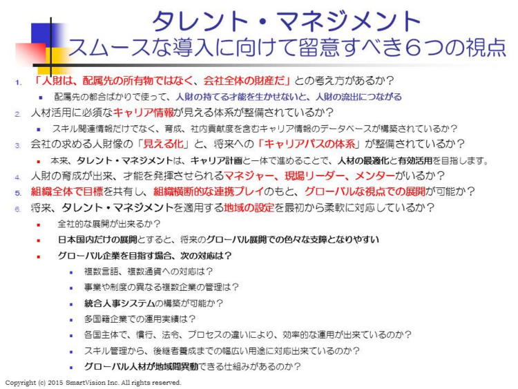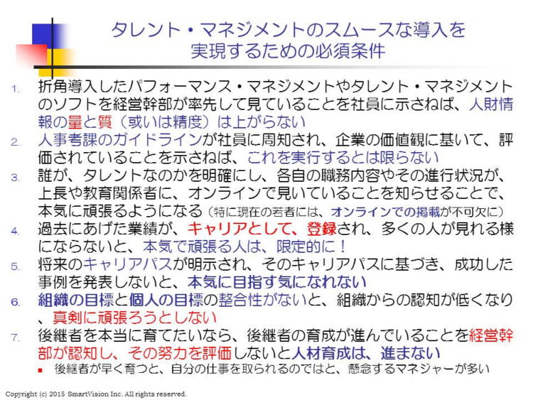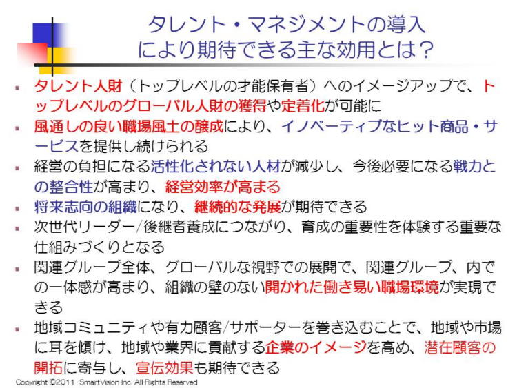タレント・マネジメントは、欧米企業の有名企業では、多くの企業で導入されていて、あって当たり前の存在になってますが、これがあることで、企業ブランドがあがり、優秀人財を採用しやすくなります。 従い、導入後の価値創造も考慮に入れて、長期的な視点で検討すべき時代です。 まずは、タレント・マネジメントの主な導入の目的を明確にして、それに最適なソフトを選定することになります。今では、100を超えるタレント・マネジメントのソフトが存在しますので、その選定には、将来の拡大戦略を考慮に入れて、選定しないと将来つまずくことになりかねません。グローバル・ビジネスを既に行っている場合は、彼らの導入状況を念頭にいれて、グローバルな視点で判断する必要があります。 最近は、クラウド版が主流で、導入費用も、現実的なお手頃な値段で、保守の心配もなく導入が可能になりました。 日本企業でも、将来アジア展開を予定している場合にも、アジアの拠点でのグローバル人財の育成を念頭いれて、現地で導入/運用/保守がしやすいものが重要になります。 本社が現地に相談なく決定して、本社の都合だけで押し付けても、現地での熱意を削ぐ形になりますので、現地側への充分な配慮が必須でしょう。 欧米の有名大学で教育を受けたグローバル人財は、企業全体でタレント・マネジメントに熱心だと感じ、自分も働いてみたいと判断し、応募数も増えますので、可能性ある新世代人財を惹きつける絶大な効果も期待できます。 特に、注意を払うべきは、日本側の経営幹部やマネジャーの意識改革が最低限必要になりますので、これを改善するためのパフォーマンス・マネジメント研修を定期的に実施しているかどうかでも、大きな違いが生じます。
