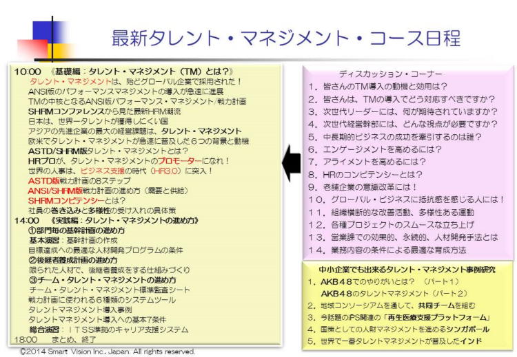 この人材データを活用出来る職場の意識改革が進められているかが問われているのです。 更に、グローバル企業として、すぐれた職場となるために求められる必要条件、その実現のための基本的考え方と進め方を学びます。従来の人材育成で、どこをどう意識改革し、変革するべきなのか? 皆さんとのコミュニケーションをしながら学ぶ貴重な1日になります。 なお、2014年の4月コースからは、SHRM/ANSIがまとめた戦力計画(WorkforcePlanning)条項案記載の内容を含めて学べます。この内容により、2015年頃には、ANSI版のHRMの標準にも、戦力計画(Workforce Planning)条項が登場することになりましょう。 参加者の皆さんは、早めに準備を進められますので、大変効率的な導入が可能になります。 ASTD版のタレント・マネジメント概念とSHRM版のタレント・マネジメント概念を比較しながら学べますので、皆さんの会社が目指す方向性を念頭に、最適の選択が可能になります。 本コースでは、2012年9月、アジア生産性機構APOのタレント・マネジメント担当チーフ・エキスパートとして、バンコクで開催した中小企業向けのタレント・マネジメント会議(全4日間)の企画及び講師の経験を持つ講師から、「グローバル・ビジネスで成功するための秘策、アジア各国でのグローバル・リーダーの育て方、優秀なグローバル・リーダーが、優秀人材が定着するカルチャーのつくり方」「大企業向けと中小企業向けは、どんな違いがあり、どんな配慮が必要なのか」を学ぶ大変良い機会にもなります。 日本で一番充実した最新情報満載の「タレント・マネジメント」テキストを使用して、皆さんの抱えるテーマを中心に実践的なアプローチでワークショップを進めます。 |