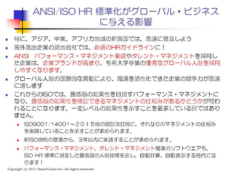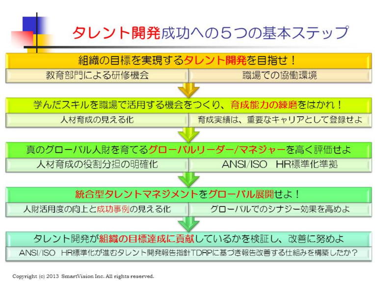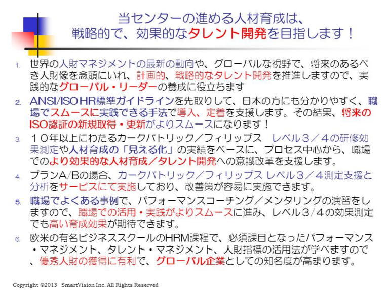 既に、日本のグローバル企業でも、パフォーマンス・マネジメントやタレント・マネジメントのソフトの導入は着実に進んでいます。 しかし、ソフトが導入されても、現場マネジャーやマネジャーの理解が進まず、一向に導入が進まない企業が多々あります。 この導入をスムースに進めるには、従来のマネジャーの意識改革を全社的に進める必要があります。 これからは、日常業務の中でフィードバックを積み重ね、その集大成として、人事考課を行い、更なる挑戦を意識づけることが求められます。これをスムースに実現するパフォーマンス・マネジメントの考え方の定着を実現するため、すくなくとも、新任マネジャーには、マネジャー向けパフォーマンス・マネジメント研修が必須になります。 更には、マネジメントの中でのタレント開発の重要性を意識づけ、どのように実施するかを学ぶのがタレント・マネジメント研修です。ソフトの使い方を知っても、これをどう活かすかは、全く別だからです。 |
