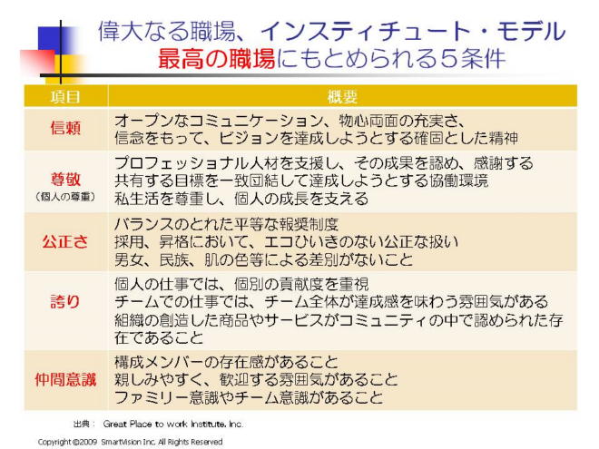 高い給与を出せば、良い人材が集まり、会社の安泰と単純に考え、実力主義や成果主義を強めた企業もありました。しかし、高給を払って、雇った社員は、他から更に高給を提示されれば、異動するかもしれない非常に不安定な人材でもあります。また、自分の実力に自信を持ち、一人で出来る自信のある人材は、新しい挑戦を求めて独立する可能性も高い。 世界中で行われている優れた職場調査においても、給与への満足感を入れるより、職場における信頼感、尊敬の気持ち、公正感、誇り、仲間意識等を中心に調査する事例が多くあります。例えば、インスティチュートモデルの事例が良い事例です。 中小企業白書でも、職場が個人の成長を支援することで、自分のキャリア達成が出来た社員は、職場に対し、メンターに対して、恩義や感謝の気持ちをもつことで、組織への貢献度も高まる傾向が強まり、職場への定着率が高まっているのと全く同じです。