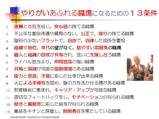 それでは、やりがいを増すには、どのような職場にするべきでしょうか? まず、構成員すべてが安心、信頼できる人間関係が基本になりますが、組織、地位、年齢とは関係なく、自分の意見を話しやすい職場環境にすることがまず第一です。かといって、ばらばらな意見の乱立で終わらず、チームとして、組織としての協働環境を築けるかも課題です。