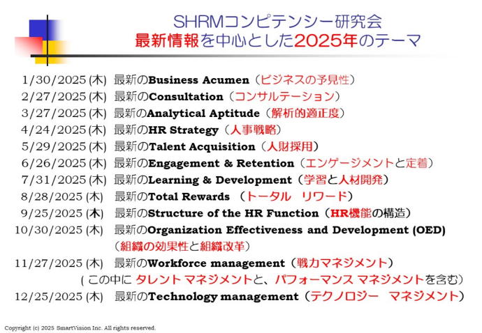 | 第1回の研究会は、2015年12月12日(土)から開始した。 過去の活動状況は、こちらからご覧になれます。 最新の活動予定に関しては、こちらをご覧下さい。 尚、本研究会は、塾ではありませんので、参加する前に必ず、最新の人材マネジメントに関するの事前学習が必要になります。 教材として、SHRM2018 Learning Systemを使用します。 これは、SHRM版の人材マネジメント関連情報を集大成したもので、知識学習の自習教材になります。この購入には、SHRM会員には、特別割引が適用されます。 従い、本研究会に参加するには、JSHRM会員であると同時に、別途、SHRM会員になると色々な情報を入手できますので、大変お得です。 Internet only memberは、年間$95で、こちらから申し込めます。 尚、学生は、更に安い、年$40で会員になれます。 会員ID入手後、会員でLog-inすると、本教材に関しても、割引料金が表示されます。 本教材の購入者は、オンラインで、模擬テストを受けられるようになります。 この中に、SHRMコンピテンシーに関する設問が多数登場しますので、試して下さい。 今後は、各種のグローバルな認定試験でも、SHRMコンピテンシー同様のコンピテンシーが採用されることになり、日本の社労士他の認定法にも、影響することになります。 SHRMコンピテンシー研究会に参加ご希望の方は、こちらのJSHRMサイトから、申し込みください。 JSHRM会員でない方は、事前にお試し会員として、登録をお願いします。 |