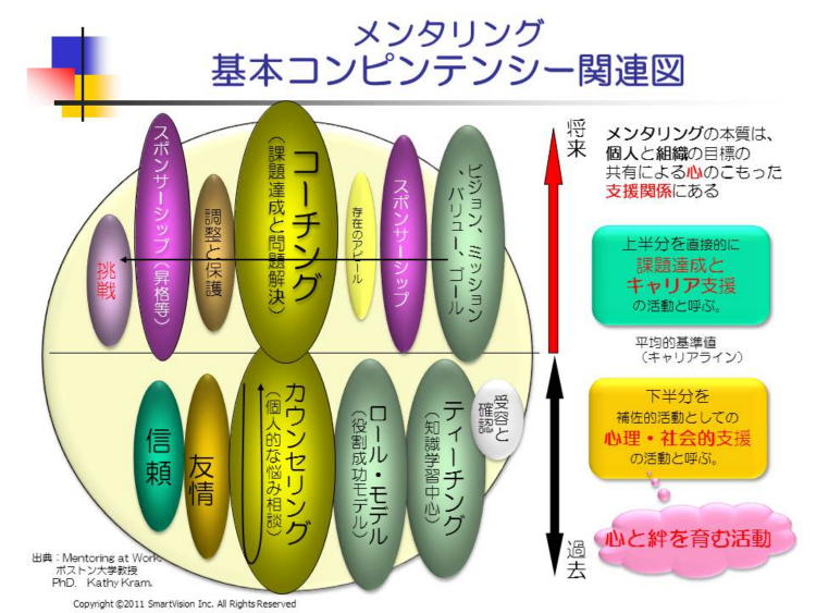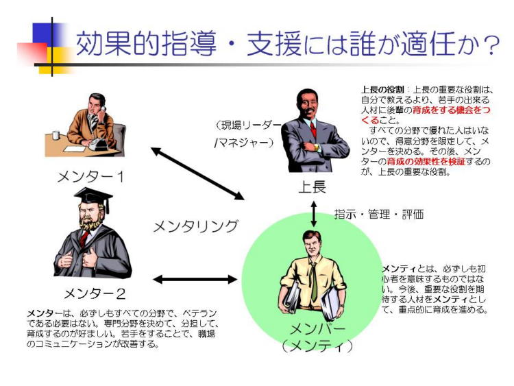 従来、メンバーの指導は、上長の仕事とみなされがちでしたが、現在のようなIT 時代では、これが果たして最適の育成体系でしょうか?メンタリングでは、指導支援に最適な若手人材(メンター)を選定し、後輩の指導・支援を通して、共に育つ職場関係を構築しようとしています。メンタリングは、単純なスキルの集まりというより、目標を共有し、共に学び、創造できる体系を上長中心に構築する人材育成の総体系とも言えます。 メンターとメンティの心の絆を重視し、長期的なキャリア意識を育て、やりがいあふれる職場を構築するものです。特に、メンタリングを効果的に活用することで、「卓越の戦略」を可能にする秘訣が隠されています。 |
