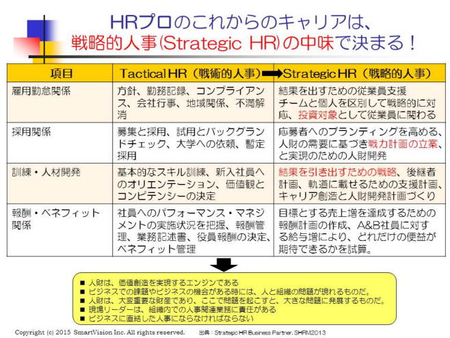 今、HRプロとして、重視されているのは、戦略的視点で、ビジネスパートナーSBP、或いは戦略的人事マネジャー/リーダーとして、どれだけ活躍したかであり、戦略的な仕事のでき具合により、HRプロのキャリアと認められることになる。 そこで、賢いHRプロの多くは、戦術的な業務は、若手人財に任せたり、外部にアウトソーシングすることを真剣に考え、実践している。それで空いた時間をより、自分の力量の向上につながる戦略的業務に集中させるようにしている。 皆さんは、如何ですか? 今、一番力をいれるべきは、戦略的目標を達成するために、どうしても必要になる現在の人事考課を見直し、コンピテンシー項目を明確化し、潜在能力のアセスメント手法や、キャリア評価システムを確立し、更には、中長期計画を達成するために不可欠の戦力計画を立て、それを実現するための人材活用や人材開発の仕組みづくりとしてのタレント・マネジメント手法をグローバルに構築することである。