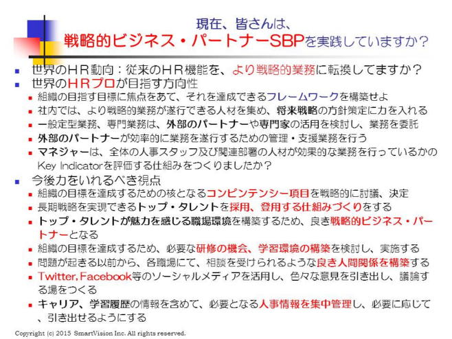 2004-2005年頃、同教授が中心になり、HRM業界の多数の専門家の意見を「これからのHRの姿」として集大成した本が登場。同教授からは、「HR Value Proposition」と言う新しい言葉も登場し、HR価値の重要性が議論になった。 その中でStrategic Business Partners、HR Business Partnersに関する書籍もいくつかあらわれ、HPIの権威であるロビンソン夫妻からも、「戦略的ビジネスパートナーSBP」の本が発売された。 また、ラルフ・クリステンセンは、「戦略HRへの道」を発表した。日本では、「戦略人事マネジャー」として、生産性出版から発売されている。 近年、SHRMでも戦略的マネジメントのセッションを強化する方針に基づき、この関連のセッションが増加し、次世代のHRの議論をするたびにSBPがホットなテーマになっている。 その背景には、景気の浮き沈みに応じて、人員調整を余儀なくされた人事部は、切ったり、はったりする戦術的な手法に走りすぎ、長期的な戦略として、イノベーションを醸成できる企業風土の実現には、大変苦労していたことに由来する。また、同時に人事部のマネジャーの多くに、女性の進出がすさまじく、SHRM大会での発表者、参加者を見ても、女性の活躍が目立つようになり、HRプロやSBPとして、更なるモチベーションアップをする必要性が出てきたこともあろう。 これは、HRプロとしてのキャリアを目指す人にとって、必見の内容でもあります。 |